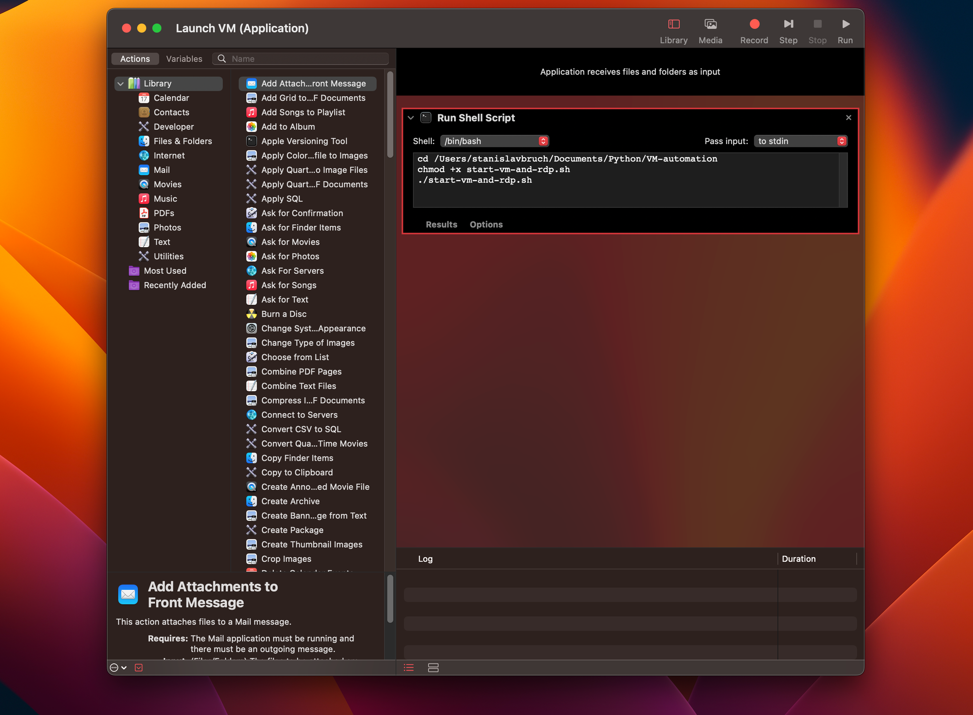 Abych nemusel lézt pokaždé do terminálu jako správný ajťák, pomocí appky Automator (nativně nainstalovaná na macOS) jsem si vytvořil aplikaci, která mi skript spouští tak, jak potřebuji.