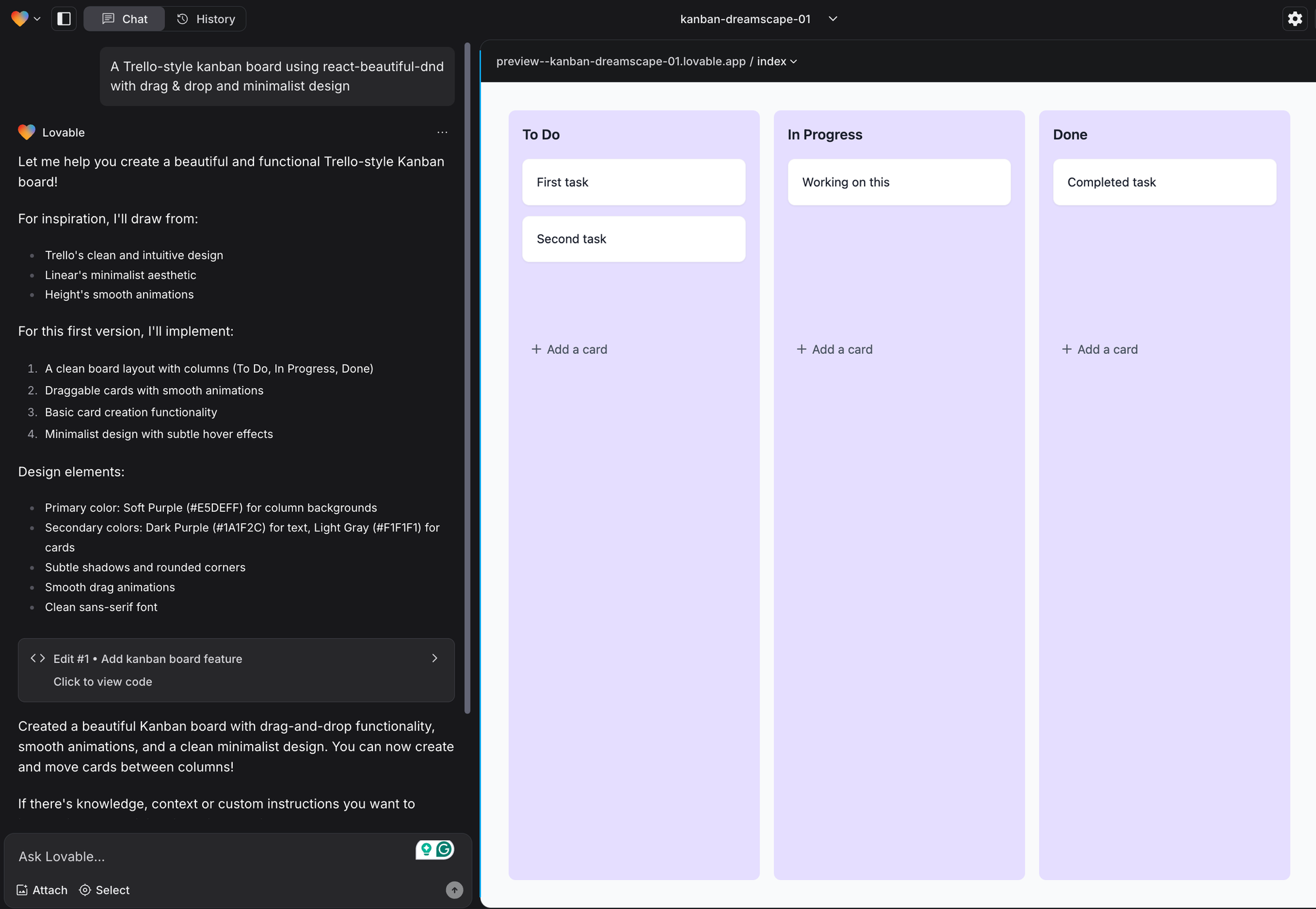 Na obrázku níže je příklad druhé verze. Abych to měl jednodušší, přidal jsem mu do přílohy obrázek skutečného Trello nástěnky, aby se inspiroval vzhledem (doporučuji využívat attachments pro kvalitnější výstupy).